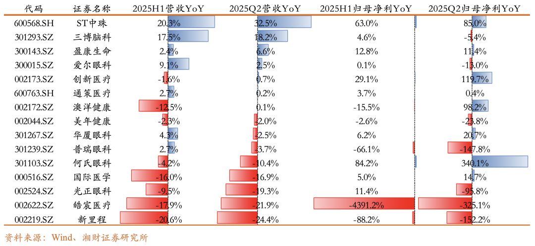 其他眼科上市公司更惨,2025Q2没有一家营收正增长的。从眼科到牙科,再到辅助生殖、脑科、肿瘤,民营连锁医院全部黯淡无光,甚至前期高景气的医美、中医、康复也从摩登到老登。