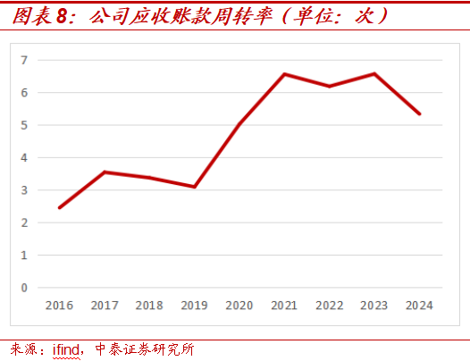 ◼公司近五年应收账款周转率高,资金周转使用效率高。公司2019-2021年应收账款周转率逐年提升,最高达6.6次;2022-2024年应收账款周转率先升后落,2024年应收账款周转率为5.3次。①在5G传统业务订单收缩的背景下,公司转向低空经济、卫星互联网等新兴领域,但部分新客户因审批流程复杂,付款周期显著长于传统通信客户;②毫米波测试系统、低空监测设备等新产品需定制化开发与安装调试,客户通常在验收完成后才支付尾款,拉长整体账期。2024年此类高毛利产品占比上升,进一步延长平均回款时间。
