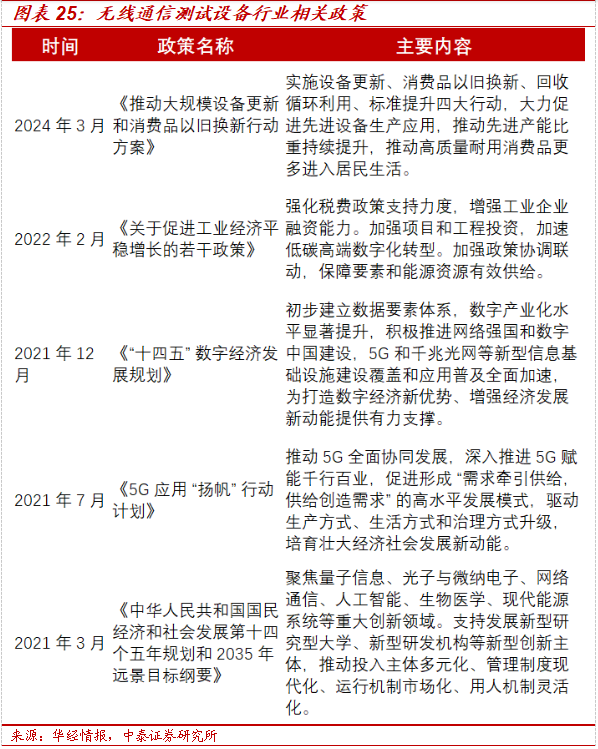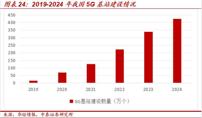 ◼ 下游应用5G基站建设持续推进,拉动通信测试设备增长。近年来,5G基站成为我国新一代信息技术基础设施建设的重点,根据工信部数据,2024年全国5G基站建设达425.1万个,5G网络建设稳步推进,由于5G基站天线测试需要在屏蔽箱里完成,因此随着天线测试需求的增加,市场对无线通信测试设备的应用需求持续扩大,行业将得到稳定发展。