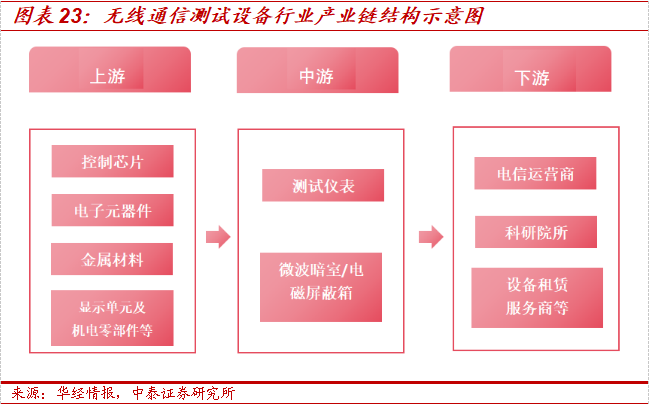 ◼ 通信测试产业链含上中下游,渗透各环节。通信测试技术与测试设备是无线通信测试产业链中重要的一环,渗透于产业链各个环节。根据无线通信测试设备行业的商业模式可将其产业链划分为上游、中游和下游。上游主要是各类金属材料、电子元器件、控制芯片、显示单元及机电零部件配件;中游主要包括各类测试仪表、微波暗室/电磁屏蔽箱、测试软件以及解决方案服务商;下游为应用行业具体包括电信运营商、终端厂商、科研院所、卫星通讯等各个涉及到射频、微波和毫米波技术的厂商。