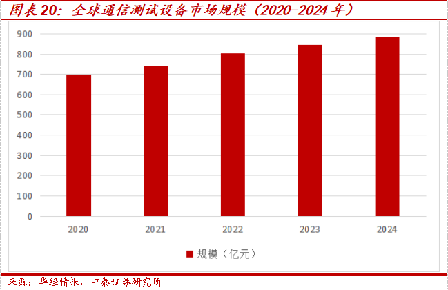 2)行业空间:多技术融合,我国无线通信测试设备市场规模增速领先全球。2024年全球无线通信测试设备市场规模为884.64亿元,2020-2024年全球无线通信测试设备市场CAGR约为5.79%;我国无线通信测试设备市场规模为250.65亿元,占全球的28.34%,2020-2024年中国市场CAGR约为13.13%,显著高于全球均值。
