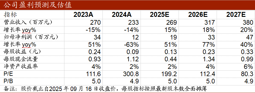 ◼首次覆盖,给予“增持”评级:根据业务拆分及盈利预测模型,我们预计2025-2027年公司营业收入分别为2.69/3.17/3.80亿元,归母净利润分别为0.19/0.33/0.47亿元,当前股价对应PE分别为199.2/112.4/80.3倍。考虑到公司产品竞争力持续增强,盈利结构有望改善,首次覆盖给予“增持”评级。
