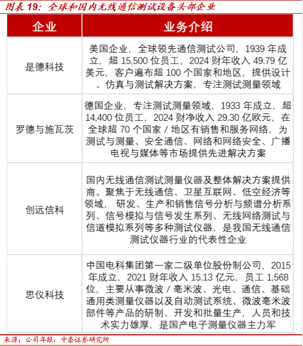 ◼ 高端技术寡头垄断,国产替代加速。全球无线通信测试设备市场格局较为集中,大多数产品和重要技术掌握在几个国外巨头厂商中,主要有是德科技、罗德与施瓦茨等。国内厂商竞争力稍弱,外资品牌在中国市场占据绝大多数份额但随着我国对无线通信与射频微波测试仪器行业的重视程度和支持力度的持续增加,国内企业的技术水平不断提高,国产设备在产品性价比、售后服务等方面的优势逐渐显现。在国产替代进口政策支持下,国内在无线通信测试设备逐渐涌现一批行业佼佼者,包括创远信科、思仪科技等企业。