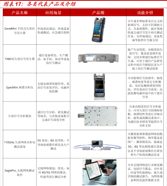 ①信号生成与分析类产品。公司的GeneMini手持式矢量信号发生器可生成多种标准及自定义射频信号,支持不同调制方式,具备便携性,为外场基站调试等提供信号源;T3661C矢量信号发生器能产生高纯度、高精度矢量信号,覆盖宽频率范围,支持多种通信标准,用于通信产品研发与生产测试。SpecMini频谱分析仪可分析测量射频信号的频率、幅度等,实时监测频谱、评估基站信号质量及电磁干扰;矢量信号分析模块具备高精度信号分析能力,可对矢量信号调制参数等详细分析,集成到测试系统助力通信研发。