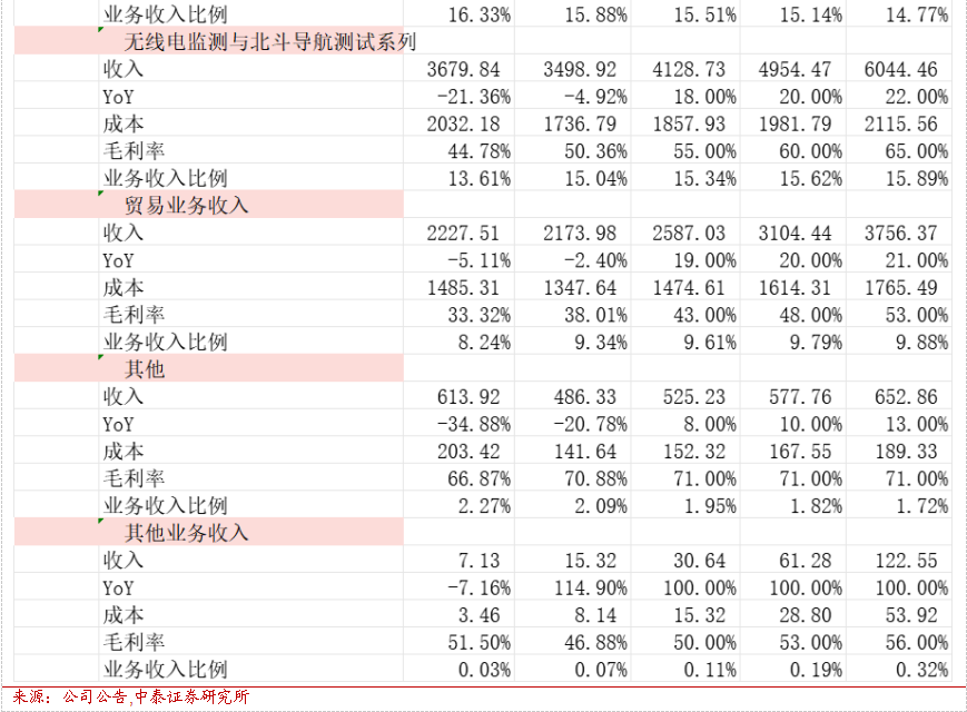 ◼ 无线电监测与北斗导航测试系列:是公司重点业务(2024年收入占比为15.04%),近年有较快发展。2025年半年度公司总营收同比增长18.44%,预计2025年全年无线电监测与北斗导航测试系列营业收入实现同步增长,未来我们认为市场逐渐呈现复苏迹象。参考历史增速情况,结合公司高端测试业务发展较快的趋势,预计2025 - 2027年该项业务营业收入分别同比增长18.0%、20.0%、22.0%。鉴于公司持续高强度的研发投入,及可比公司坤恒维顺类似业务近三年毛利率55.89%-66.47%,预计毛利率不断提升,2024年为50.36%,2025 - 2026年分别为 55.00%、60.00%、65.00%。