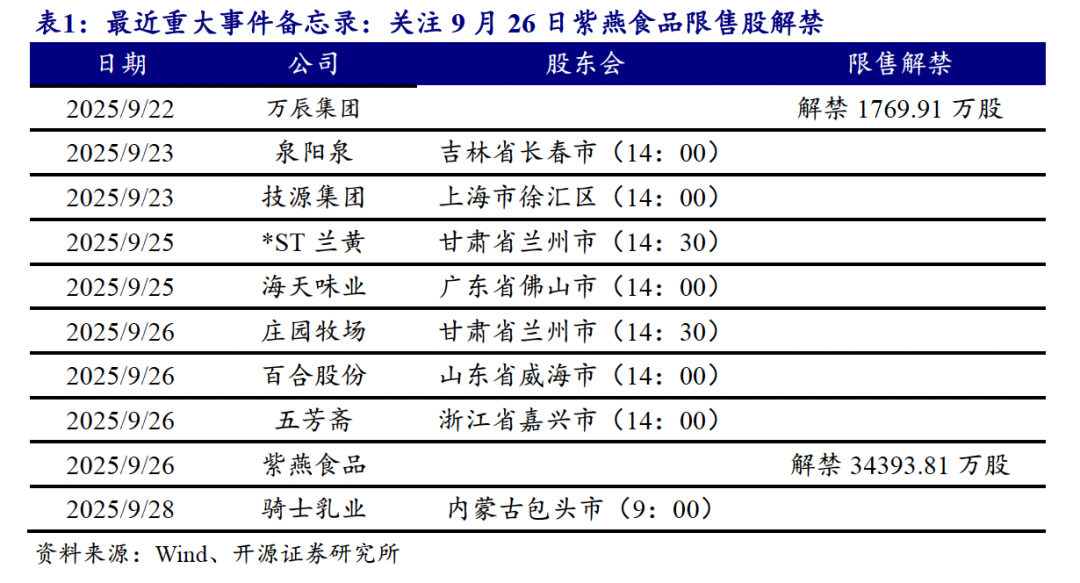 2、【一鸣食品】公司关于2025年半年度权益分派实施公告。公司将于2025年9月26日以本次方案实施前的公司总股本401,000,000股为基数,每股派发现金红利0.025元(含税),共计派发现金红利10,025,000元。发派对象为截至股权登记日下午上海证券交易所收市后,在中国证券登记结算有限责任公司上海分公司登记在册的本公司全体股东。
