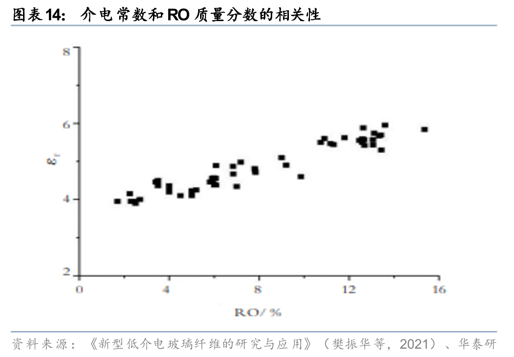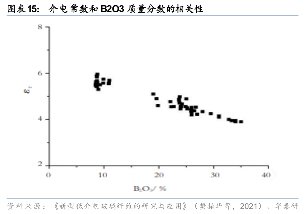 与普通玻璃纤维相比,低介电电子纱在原材料成分配比上差异较大。据《新型低介电玻璃纤维的研究与应用》(樊振华等,2021),玻璃的电学性能和工作参数无法两全,即当电学性能满足要求时,玻璃中由于较低质量分数的碱金属和碱土金属离子而使成纤温度过高 ;反之,为了使玻璃具有合适的成纤温度,提高玻璃中的碱金属和碱土金属离子的质量分数时,电学性能又受到了影响。因此,开发新的具有优良工艺性和操作性、耐水性良好的低介电常数玻璃纤维需要综合考虑两方面因素。据《5G用电子级玻璃纤维布发展现状及趋势》(陶应龙,2022),电子布的介电性能与其SiO2、B2O3、Al2O3等氧化物组分的含量有直接关系,其中低介电电子布的Al2O3和MgO+CaO含量明显低于普通电子布,而B2O3的含量则明显高于普通电子布。根据《新型低介电玻璃纤维的研究与应用》(樊振华等,2021)的研究总结,介电常数与碱土金属(RO)的质量分数成正相关关系,与B2O3等氧化物质量分数成负相关关系。