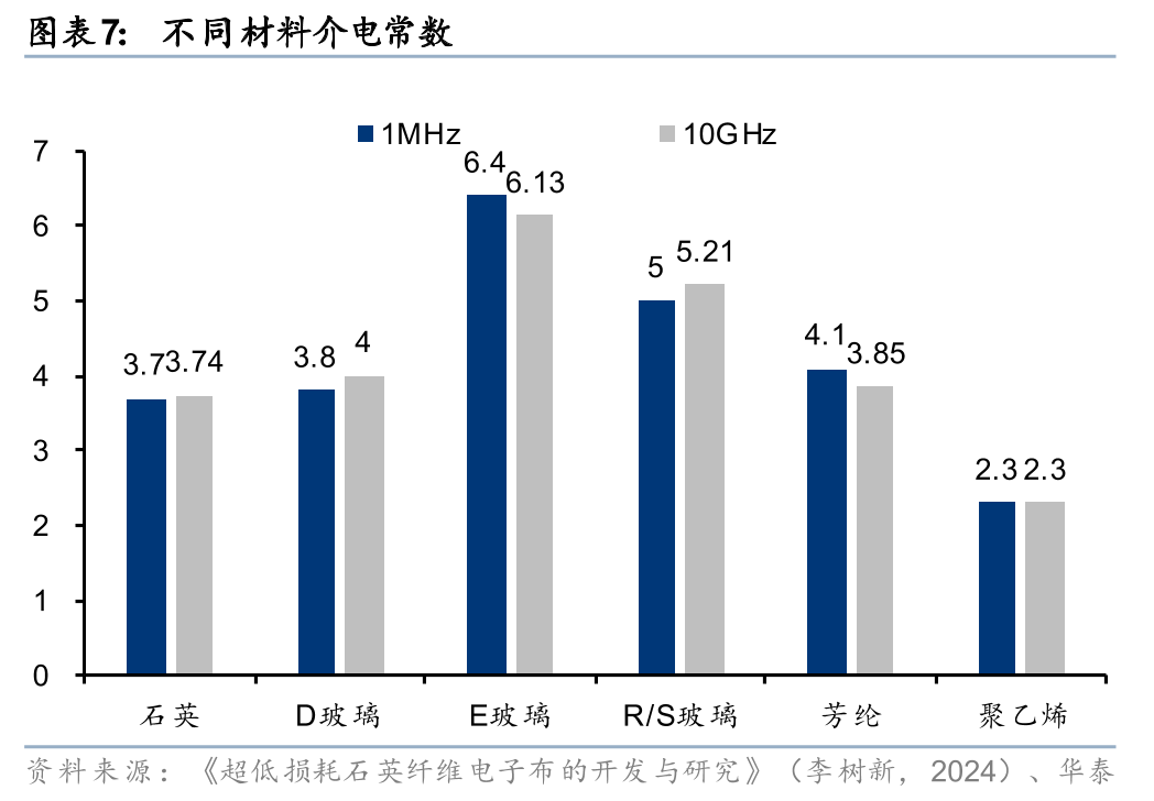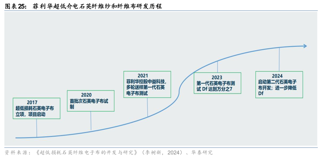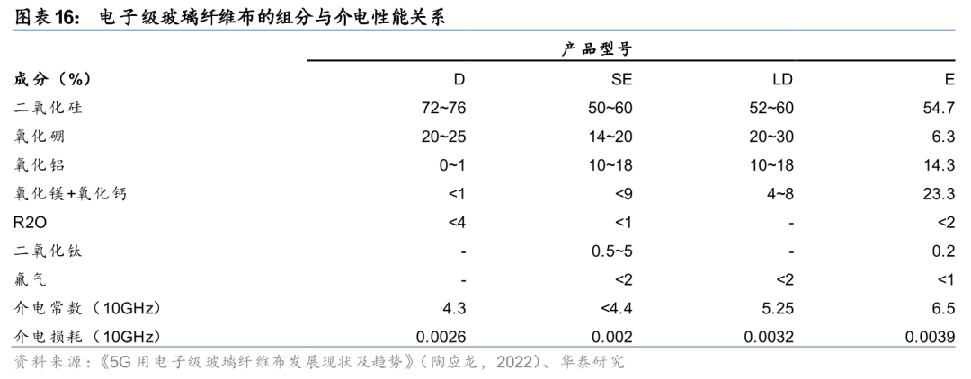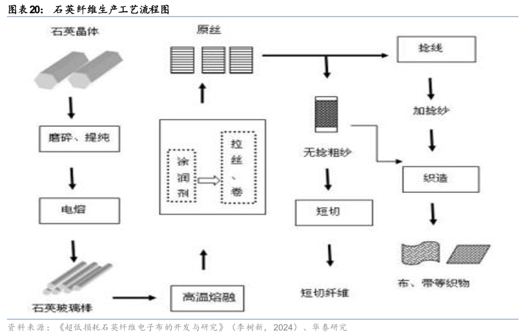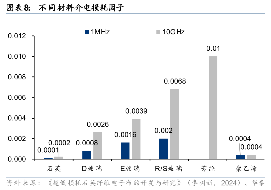 3)从玻璃纤维升级至石英纤维。石英纤维是一种非常优异的耐高温材料,早期广泛应用于航空航天的防热隔热罩及烧蚀材料。石英纤维的主要成分是二氧化硅,含量通常>99.95%,其介电常数在1MHz下约为3.7,10GHz下约为3.74,介电损耗在1MHz下为0.0001,是矿物纤维中介电常数、介电损耗因数最低,热膨胀系数最低的透波材料之一。同时,石英纤维还具有较高的软化温度和较低的热膨胀系数,能够在高温和高频环境下保持稳定的性能。随着AI服务器、交换机往800G以上发展,随着高速传输需求增加,对CCL材料的介电损耗因数要求逐步提高,因此石英纤维布(Q布)成为下一代覆铜板(M9)的关键材料。