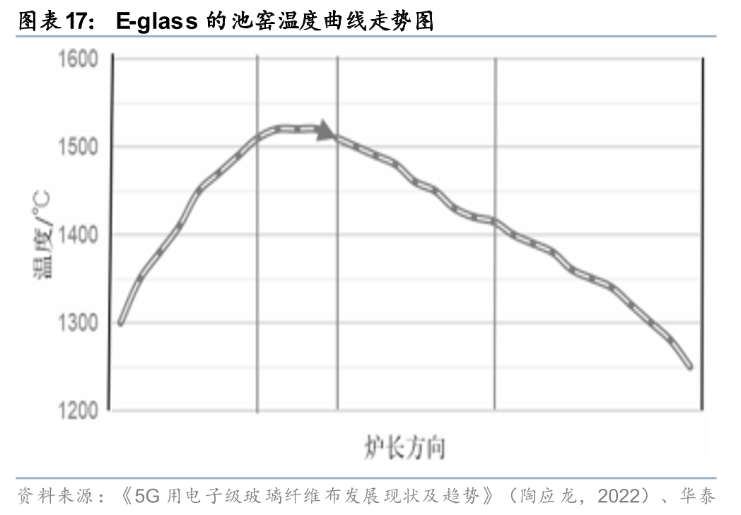 从生产环节看,低介电电子纱的开发难点主要在于其融化温度较高。以普通E-glass的池窑温度曲线为例,沿窑炉长度方向可分为熔化带、澄清带、均化带和冷却带,各带温度有不同的要求,而低介电窑由于成分不同,其融化温度比普通E-glass窑炉要高出约100-150度,各段温度不易控制,造成窑体使用寿命相对较短。同时,由于低介电电子纱的成分中B2O3的含量较高,在高温下挥发性较强,会使得HF(中空纱)更加难以控制,若形成HF则可能影响电子纱和电子布的强度,还会影响覆铜板与PCB的电绝缘性。