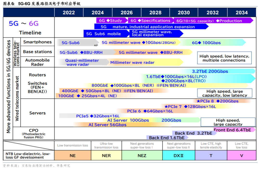 电子布是提升覆铜板介电性能的关键材料。高频高速应用领域对覆铜板电性能要求非常高,介电损耗因数越大、介电常数越高,传输损耗越大,因此低介电常数、低介质损耗因数的高频高速覆铜板成为行业发展的主流。一般普通的电子级玻纤布的介电常数超过6.0,而环氧树脂的介电常数约3.9,所以降低玻纤布的介电常数是降低覆铜板介电常数的有效途径,电子布生产企业需要根据CCL的介电需求开发对应等级的低介电电子布。以电子布龙头企业日东纺为例,其针对下游应用领域对介电性能要求的不同开发出了从Low transmission Loss、Ultra-low transmission Loss以及Low CTE low loss等不同电子布产品。