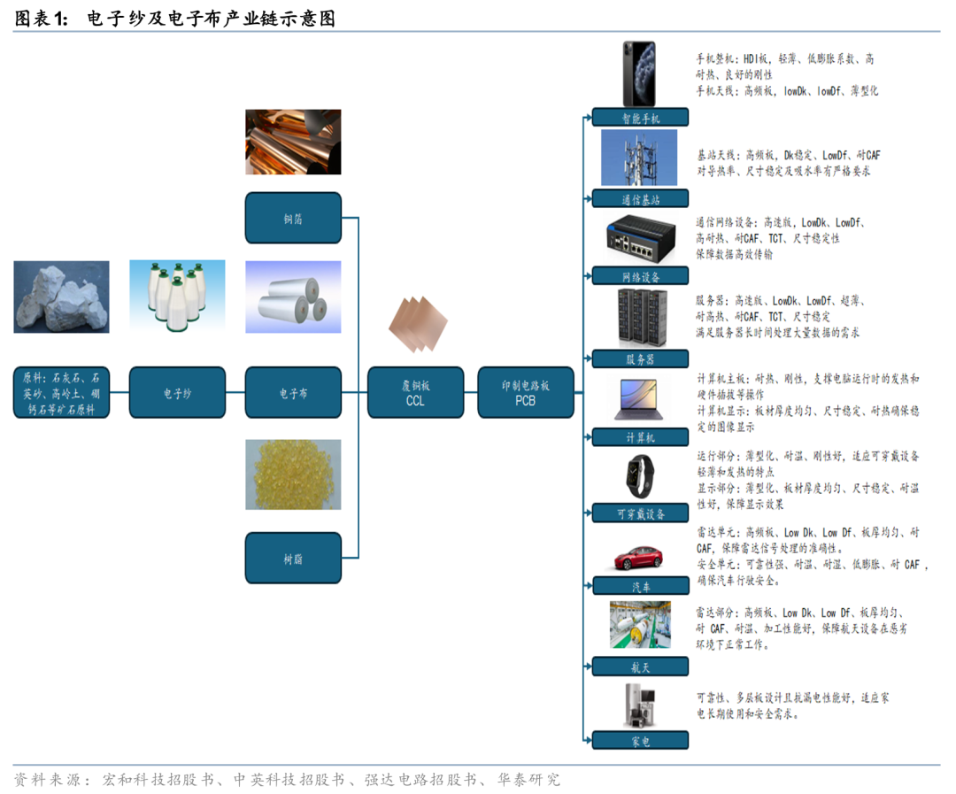 电子玻纤布为高端玻纤制品,下游应用主要集中在电子制造业的关键领域。根据我们在深度报告《重识建材八:AI驱动电子纱产业升级》(20250214)中的分析,电子级玻璃纤维纱(简称电子纱)一般是由单丝直径9微米以下的玻纤单丝制成,其织造成的玻纤布被称为电子布,据宏和科技招股书,电子纱占电子布成本约50%-60%,是电子布最主要的原材料。电子布是电子领域的关键上游材料,电子布与铜箔和合成树脂共同构成覆铜板(CCL),能为覆铜板提供充足的机械强度和尺寸稳定性,而CCL则是印制电路板(PCB)的重要基础材料。PCB被广泛应用于通信设备、半导体、汽车电子等高端领域。随着5G、AI、自动驾驶和新能源汽车的发展,高频高速PCB和CCL的需求增加,进一步推动了高性能电子布的市场需求。