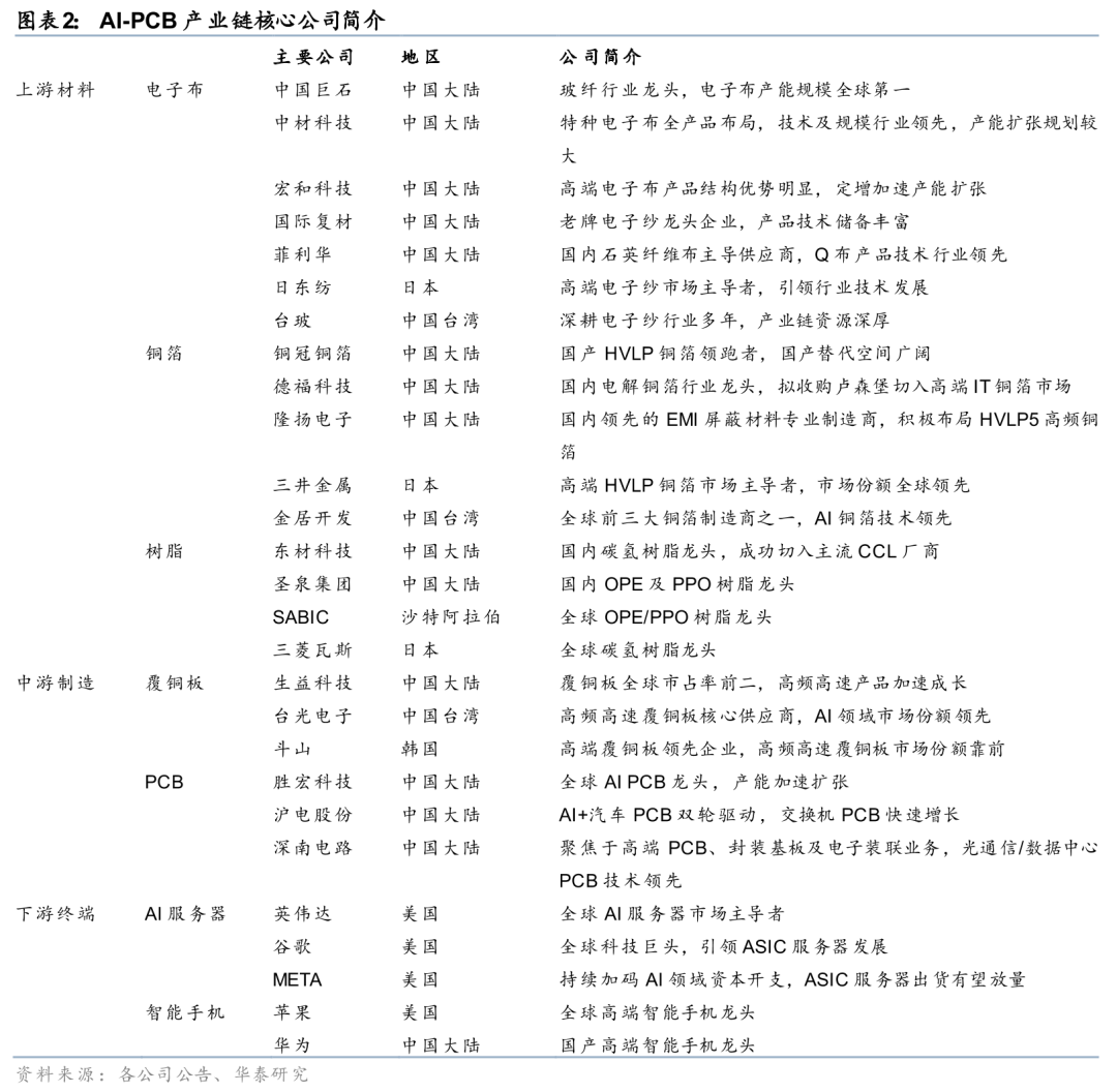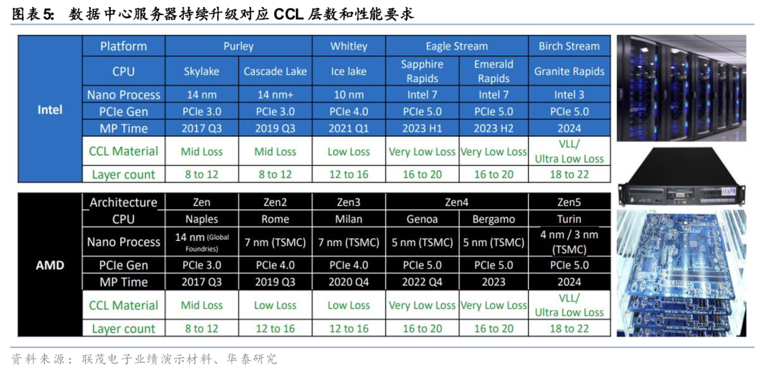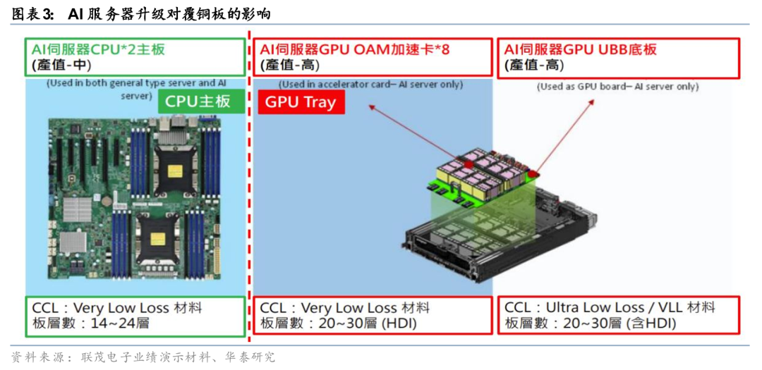 AI服务器对布线密度和信号传输能力的要求日益提高,推动了高层数PCB和高密度互连(HDI)技术成为主流应用,同步带动上游CCL材料升级。据联茂电子业绩演示说明材料,AI服务器由传统的CPU升级到GPU后,对CCL的要求将从Very Low Loss材料升级到Ultra Low Loss材料,板层数也由14-24层升级到20-30层。