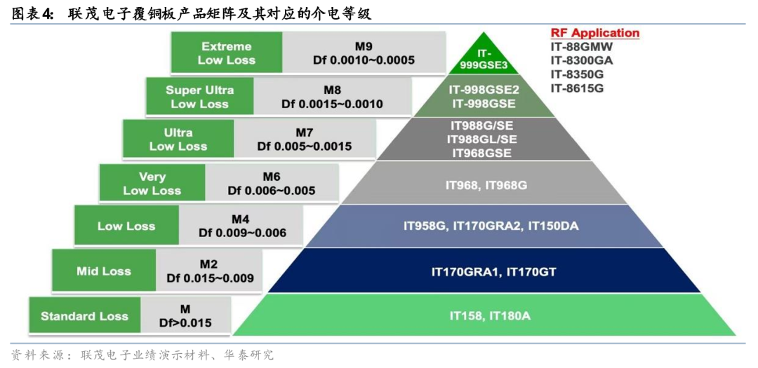 介电常数(Dk)是指在外加电场作用下,介质中产生的感应电荷导致电场强度减小的程度。介电损耗因数(Df)又称介质损耗正切值,是指电介质在交变电场中由于消耗部分电能而使电介质本身发热的现象,反映了电介质在交变电场中由于导电电流和极化滞后效应所引起的能量损耗。业内根据Df将覆铜板分为六个等级,传输速率越高对应需要的Df值越低,以5G通信为例,其理论传输速度10-20Gbps,对应覆铜板的介质损耗性能至少需达到中低损耗等级。Df越低,材料的技术难度越高。以联茂电子为例,其覆铜板产品矩阵由Standard Loss到Extreme Ultra Low Loss分为七个等级,对应的Df值由0.015以上到0.0010~0.0005。