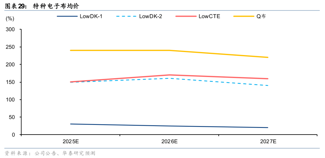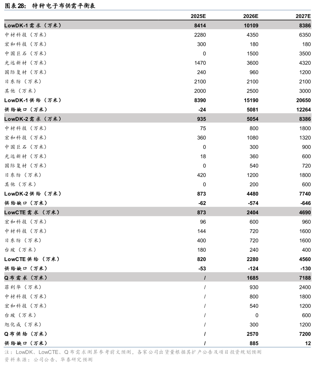 近期由于龙头公司大规模扩产引发市场对特种电子布供给格局的担忧,我们测算了25-27年特种电子布供需平衡表,我们认为25年各类特种电子布产品均处在供给紧缺的状态,且由于需求快速增长而供给端存在配方、工艺、认证等方面壁垒,我们预计LowDK-2和LowCTE的供给紧缺仍将持续到26年。同时,Q布作为下一代特种电子布的主要选择方案之一,国内厂商积极推进产品研发及产能扩张,我们预计26年Q布有望迎来量产元年,但需求及放量节奏仍将等待技术路线的确定和终端产品投放市场的节奏。