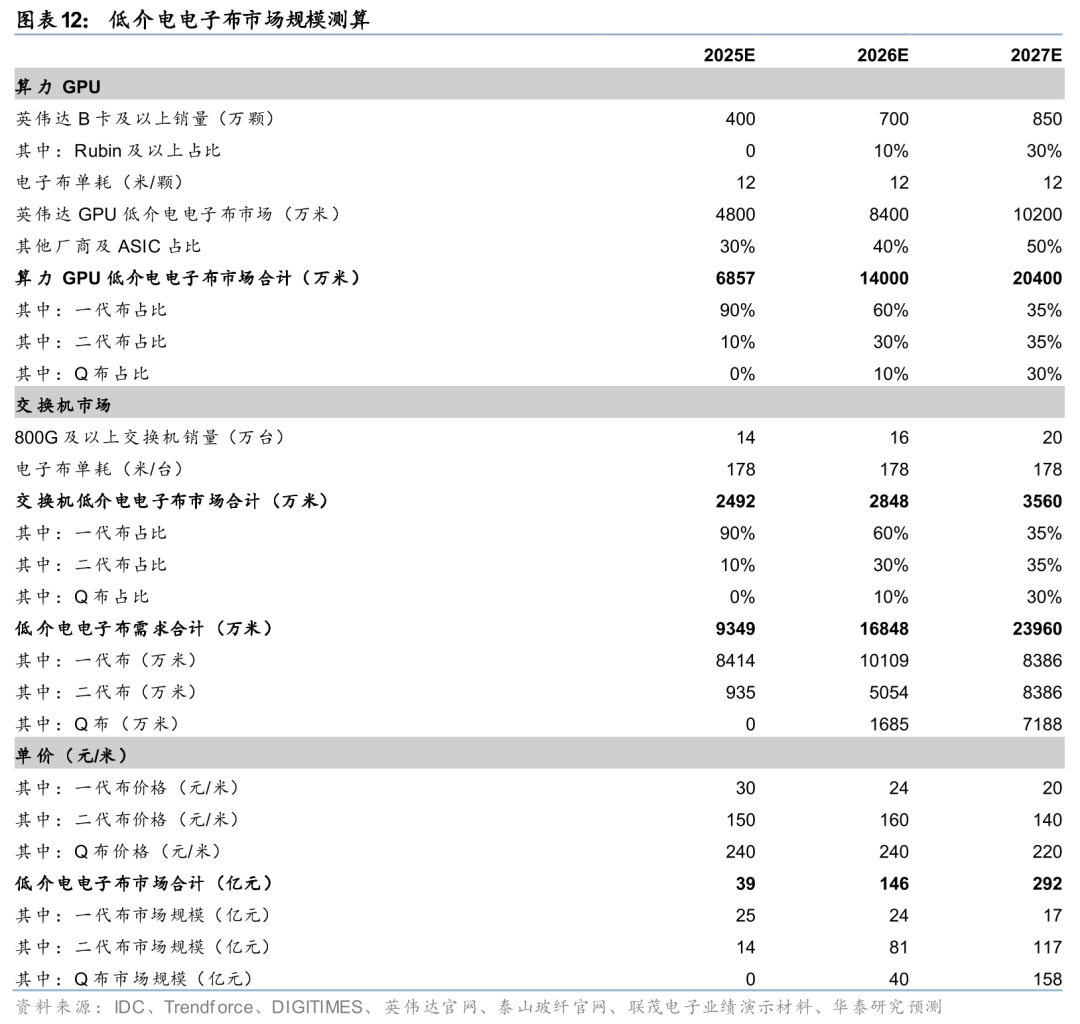 虽然当前最新一代产品对覆铜板和电子布技术路线的选择尚未完全确定,但我们预计Rubin Ultra或将引入PCB正交背板,对高频高速及低损耗的要求进一步提升,因此覆铜板及电子布方案或将采用搭载Q布的M9覆铜板。根据英伟达官网,我们预计其最新一代架构Rubin有望于2026年量产,我们假设26/27/28年Rubin及以上的算力GPU出货量占比达到10%/30%/60%。参考联茂电子业绩演示材料,高端算力GPU将使用20-30层HDI板,考虑单层HDI板的面积约为0.067平方米左右,我们假设单颗算力GPU使用低介电电子布约为12米。假设Rubin Ultra系列开始使用Q布,GB300系列开始使用LowDK-2电子布,我们预计25/26/27年算力GPU中LowDK-1/LowDK-2/Q布的需求占比为90%/10%/0%、60%/30%/10%、35%/35%/30%。此外,考虑ASIC需求有望逐步提升,我们假设25/26/27年其他厂商及ASIC需求占比为30%/40%50%,综上测算25/26/27年算力GPU低介电电子布市场需求合计6857/14000/20400万米。