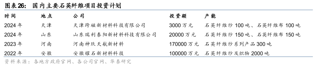 石英纤维项目投资强度较高,新建项目规模相对较小。据我们统计,目前国内具备石英纤维生产能力的企业还包括天津跨磁新材料、宁波精石纤维科技、安徽耀石新材料、山东瑞利泰阳、河南神玖天航新材料等,近年来部分企业开始布局新建石英纤维项目,如山东瑞利泰阳年产300吨石英纤维制品项目、天津跨磁新材料石英纤维制品研发生产基地项目、河南神玖天航新材料股份有限公司年产300吨石英纤维系列产品改扩建项目等,虽然项目单吨投资强度较高(30万元/吨以上)但整体生产规模都相对较小,且均通过外采石英棒的方式进行石英纤维生产,不具备产业链一体化优势。