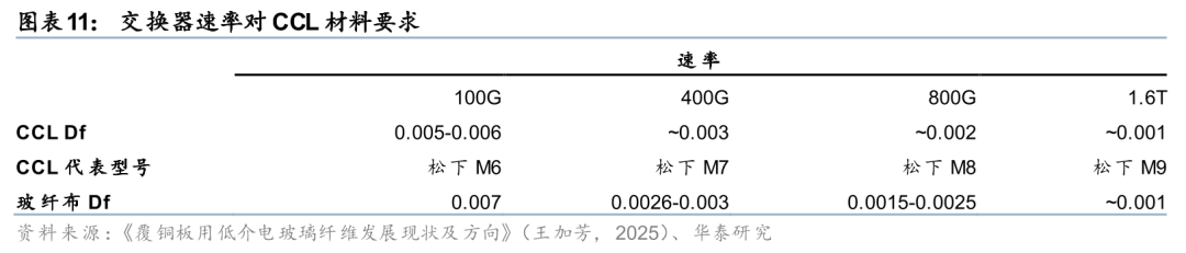 800G以上交换机同样有望带动Q布需求增长。2022年以来,随着AI服务器、交换器加速往高阶800G 设计走,带动高频高速CCL 和PCB 的需求量显著增加。在交换器升级过程中,由于高速传输需求,对CCL 材料的介电损耗因数要求逐步提高,当交换器速率提升到1.6T时,所需要的电子布Df值应小于0.001,普通的低介电玻纤布较难到达要求,因此Q布或将成为较好的解决方案,未来若800G以上的交换机出货量持续提升,有望带动Q布的需求进一步增长。