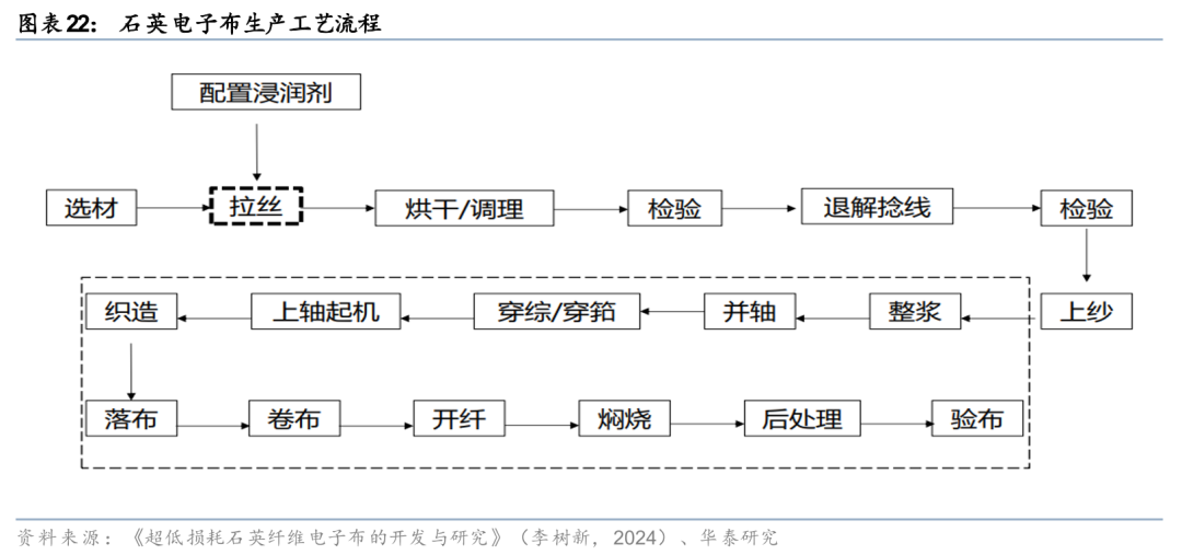 特种电子布具备较高生产壁垒,关注原材料、配方及织布机。我们认为特种电子布生产的各个环节均存在较高的技术难点,其中:1)配方,根据《新型低介电玻璃纤维的研究与应用》(樊振华等,2021)的研究总结,介电常数与碱土金属(RO)的质量分数成正相关关系,与B2O3等氧化物质量分数成负相关关系。同时,与普通玻璃纤维相比,特种电子纱在原材料成分配比上差异较大且融化温度较高,而石英纤维玻璃丝比较脆,拉丝时容易断裂,因此生产上具备较高难度;2)原材料,由于石英纤维布需要使用纯度较高的石英纤维纱和高纯石英砂作为原料,我们保守测算生产1亿米石英纤维至少需要用到1万吨高纯石英砂,因此具备全产业链供应能力或能批量稳定供应高纯石英砂的企业有望受益;3)织布机,石英纤维纱比较脆,拉丝时容易断,同时熔点很高,耐燃性能好,刚性更好,但柔韧性比较差,因此在织布及加工上仍存在较高难度。目前大部分的特种电子布均需要进口丰田的JAT910型织布机,单台织布机对应月有效产量约0.7万米,织布机的交货周期可能成为扩产的瓶颈之一。此外,我们认为下游客户的验证和认可也是重要壁垒,体现为跟随下游客户快速迭代升级的稳定供应链关系。