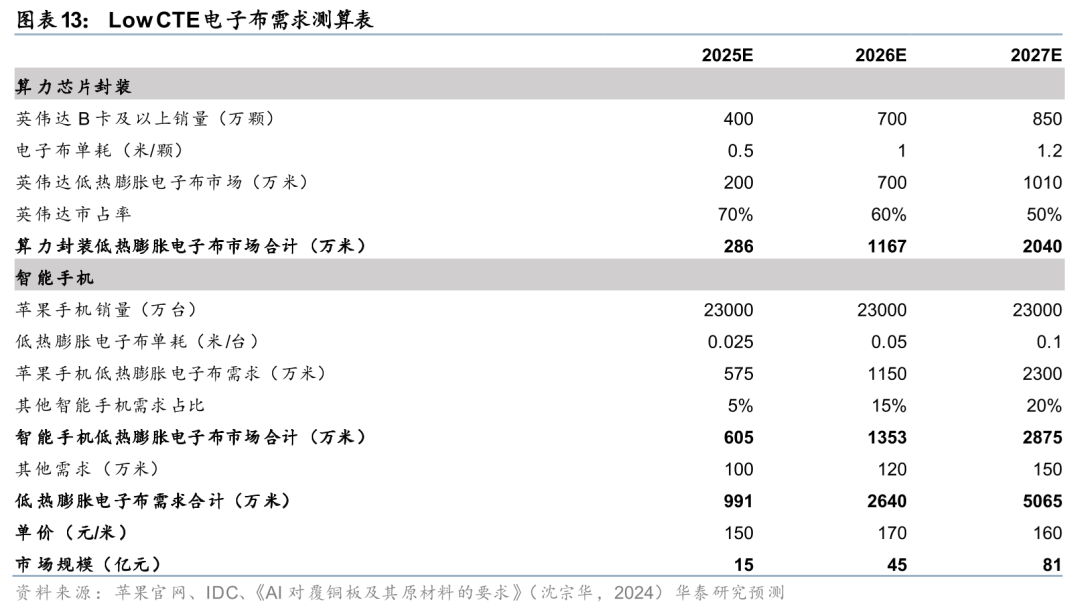 智能终端热量要求提升有望带动LowCTE需求快速提升。目前LowCTE主要用在芯片封装载板等领域,在智能手机等终端中应用相对较少,而在iPhone机身等封闭、紧凑的环境中,热量不容易消散,如果无法正确处理它,温度升高会导致其他组件膨胀,进而可能会缩短其使用寿命,导致性能问题,并对电池寿命产生严重影响,且随着高端智能手机的性能逐步提高,对散热及能耗的要求也会进一步提升,因此LowCTE玻璃纤维布将是手机管理热量的关键部分。据华尔街见闻报道,2025年iPhone17首次采用LowCTE玻纤布,我们认为未来若在智能终端上逐步将普通玻纤布替代为LowCTE玻纤布,有望为LowCTE未来需求增长的重要驱动因素。据IDC,2024年苹果手机全球销量为2.3亿台,考虑25年为首次使用,我们假设若单台苹果手机LowCTE使用量为0.025米(占总需求量约10%),则对应LowCTE需求量或超600万米;若单台使用量提升至0.05米(占需求量约20%),且其他手机LowCTE需求占比由5%提升至15%,则对应LowCTE需求量或超1350万米,考虑当前全球具备LowCTE生产能力的公司相对较少(仅有日东纺、宏和科技、中材科技等),预计LowCTE供给或将延续较为紧缺的趋势。