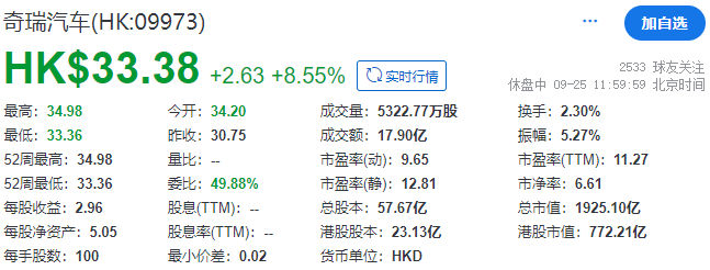 截至午间收市,奇瑞汽车每股收报33.38港元,涨8.55%,总市值约1925.10亿港元。