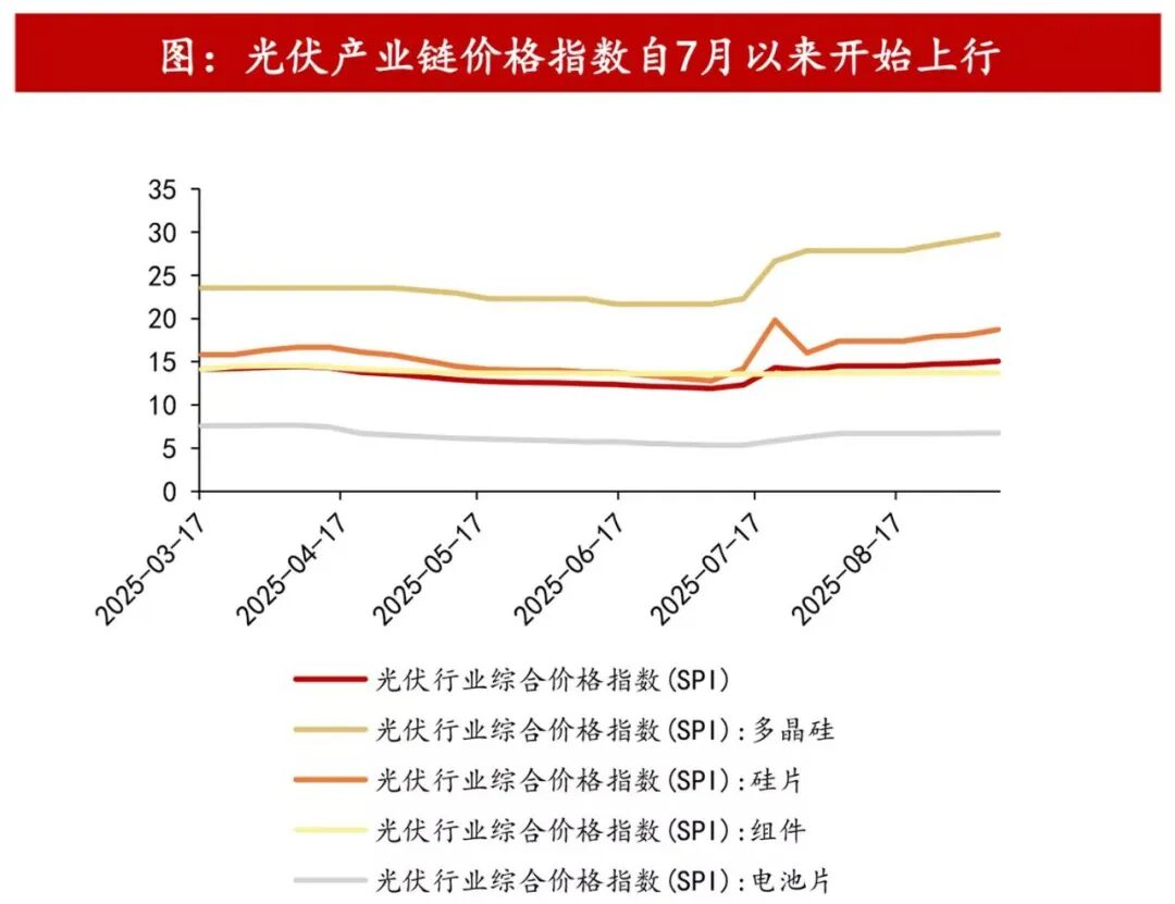 2025年7月以来,锂电池原材料价格和光伏产业链价格上涨,表明行业景气度提升。8月19日,工业和信息化部、中央社会工作部、国家发展改革委、国务院国资委、市场监管总局、国家能源局联合召开光伏产业座谈会,进一步规范光伏产业竞争秩序。国家各部委均在积极响应反内卷政策,发改委、工信部、市场监管总局从各维度着手管理,有望破除内卷式竞争实现高质量发展。反内卷政策持续推进,供给约束或有利于行业景气上行。