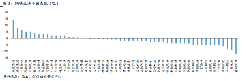 本周钢铁板块中涨跌幅前三的分别为武进不锈(14.07%)、友发集团(8.26%)、中信特钢(5.73%)。