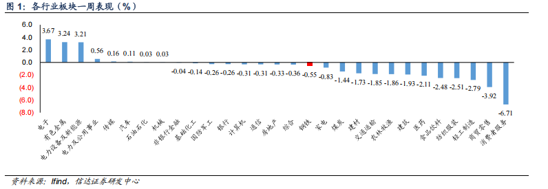 本周钢铁板块下跌0.55%,表现劣于大盘;本周沪深300上涨1.07%到4550.05;涨跌幅前三的行业分别是电子(3.67%)、有色金属(3.24%)、电力设备及新能源(3.21%)。