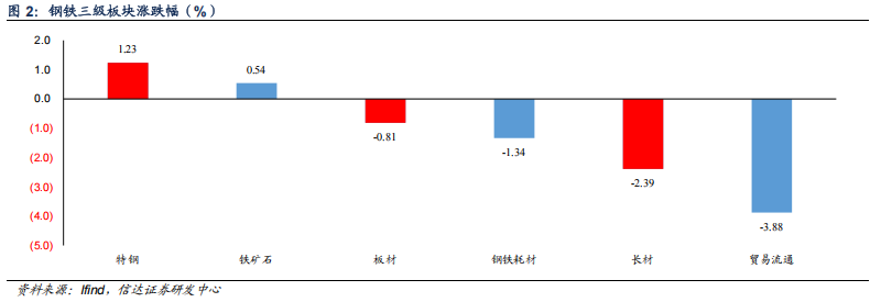 本周特钢板块上涨1.23%,长材板块下跌2.39%,板材板块下跌0.81%;铁矿石板块上涨0.54%,钢铁耗材板块下跌1.34%,贸易流通板块下跌3.880%。