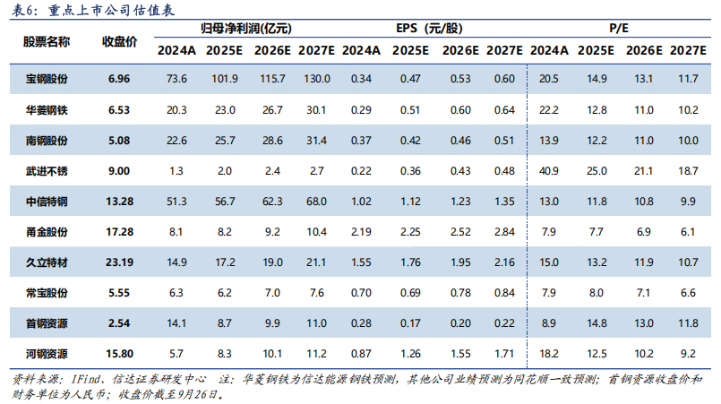 投资建议:虽然钢铁行业现阶段面临供需矛盾突出等困扰,行业利润整体下行,但伴随系列“稳增长”政策纵深推进,钢铁需求总量有望在房地产筑底企稳、基建投资稳中有增、制造业持续发展、钢铁出口高位等支撑下保持平稳或甚至边际略增,反观平控政策预期下钢铁供给总量趋紧且产业集中度持续趋强,钢铁行业供需总体形势有望维持平稳。与此同时,经济高质量发展和新质生产力宏观趋势下,特别是受益于能源周期、国产替代、高端装备制造的高壁垒高附加值的高端钢材有望充分受益。总体上,我们认为未来钢铁行业产业格局有望稳中趋好,叠加当前部分公司已经处于价值低估区域,现阶段仍具结构性投资机遇,尤其是拥有较高毛利率水平的优特钢企业和成本管控力度强、具备规模效应的龙头钢企,未来存在估值修复的机会,维持行业“看好”评级。建议关注:1)设备先进性高、环保水平优的区域性龙头企业山东钢铁、华菱钢铁、首钢股份、沙钢股份、三钢闽光等;2)布局整合重组、具备优异成长性的宝钢股份、南钢股份、马钢股份、新钢股份、鞍钢股份等;3)充分受益新一轮能源周期的优特钢企业中信特钢、久立特材、方大特钢、常宝股份、武进不锈、友发集团等;4)具备突出竞争优势的高壁垒上游原料供应企业首钢资源、河钢资源、方大炭素等。