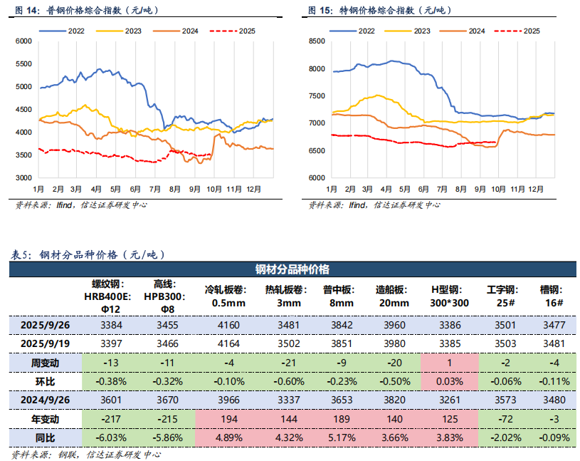 钢材价格&利润。截至9月26日,普钢综合指数3497.6元/吨,周环比下降9.66元/吨,周环比下降0.28%,同比增加0.40%。截至9月26日,特钢综合指数6651.5元/吨,周环比下降2.48元/吨,周环比下降0.04%,同比增加1.03%。截至9月26日,螺纹钢高炉吨钢利润为14元/吨,周环比下降8.0元/吨,周环比下降36.36%。截至9月26日,建筑用钢电炉平电吨钢利润为-127元/吨,周环比增加5.0元/吨,周环比增加3.79%。
