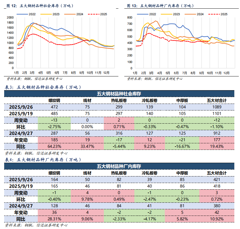 ⚫ 五大钢材品种社会库存:截至9月26日,五大钢材品种社会库存1089.2万吨,周环比下降12.16万吨,周环比下降1.10%,同比增加19.43%。