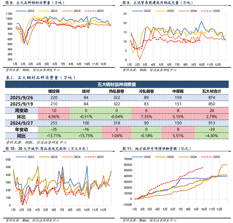 ⚫五大钢材品种消费量:截至9月26日,五大钢材品种消费量874.1万吨,周环比增加23.73万吨,周环比增加2.79%。