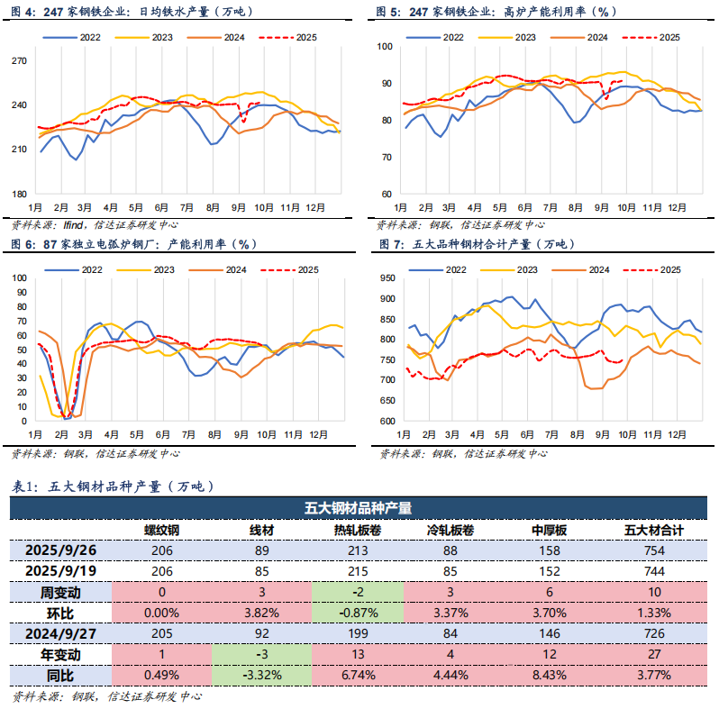 供给情况。截至9月26日,样本钢企高炉产能利用率90.9%,周环比增加0.51百分点。截至9月26日,样本钢企电炉产能利用率52.1%,周环比下降2.28百分点。截至9月26日,五大钢材品种产量753.6万吨,周环比增加9.90万吨,周环比增加1.33%。截至9月26日,日均铁水产量为242.36万吨,周环比增加1.34万吨,同比增加18.53万吨。