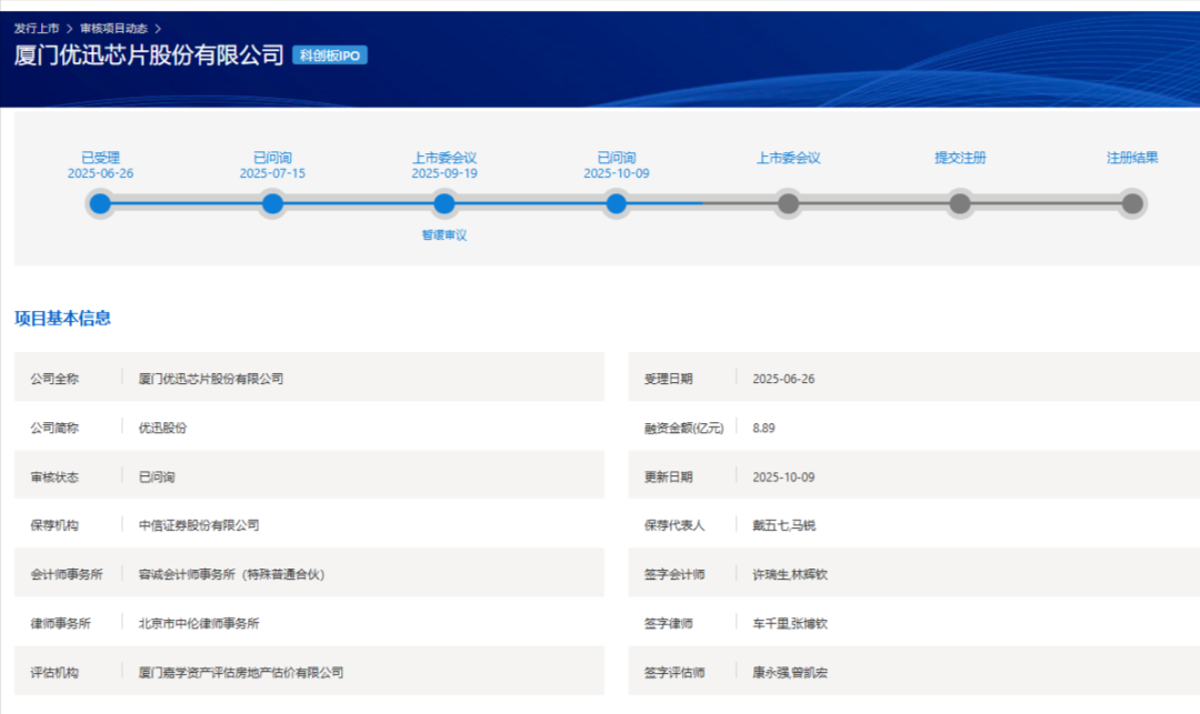 上交所上市审核委员会10月9日公告显示,定于2025年10月15日召开会议,审议厦门优迅芯片股份有限公司(以下简称“优迅股份”)首发事项。此前,优迅股份的科创板IPO在2025年9月19日的上市委会议上被暂缓审议。