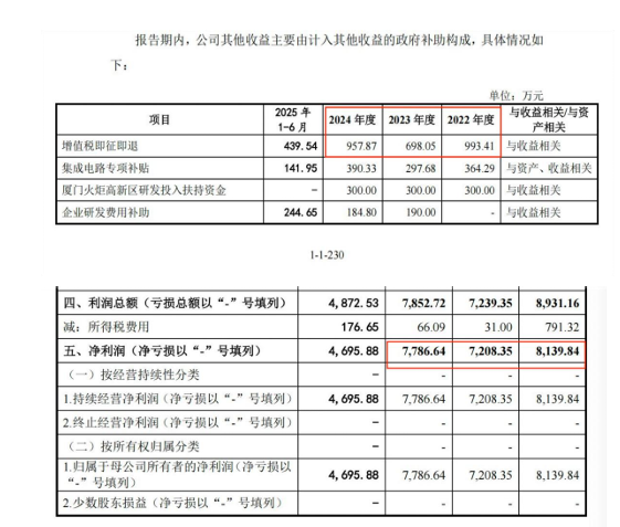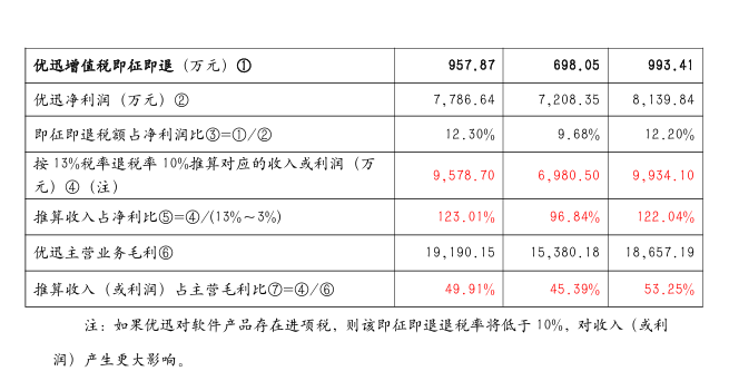 优迅芯片正是该政策的受益者之一。爆料材料分析称,根据厦门优迅公开财务数据,报告期内软件退税对利润贡献极高,2019年至2022年间,退税相关收益占净利润比例分别达到122.04%、96.84%、123.01%。换言之,企业利润几乎完全依赖退税支持。