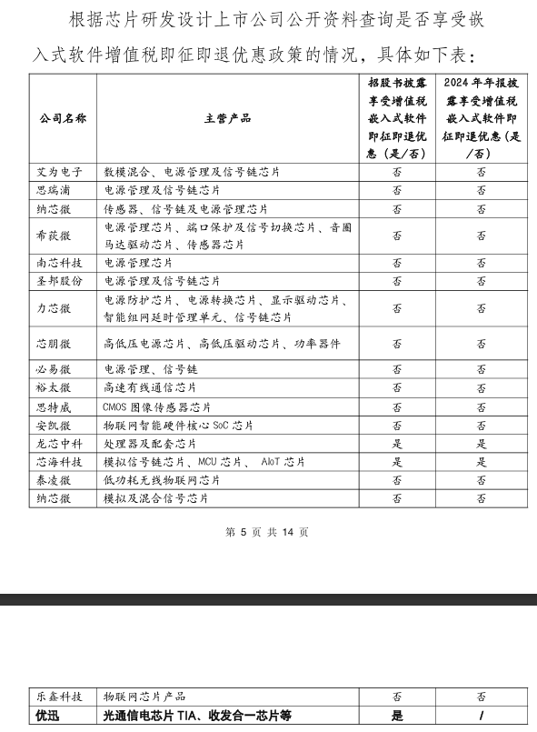 从以上同行业上市公司的对比可以得出结论:优迅作为模拟芯片设计为主的企业却享受享受嵌入式软件增值税即征即退政策,这是严重违反芯片设计行业惯例,存在重大异常情形。