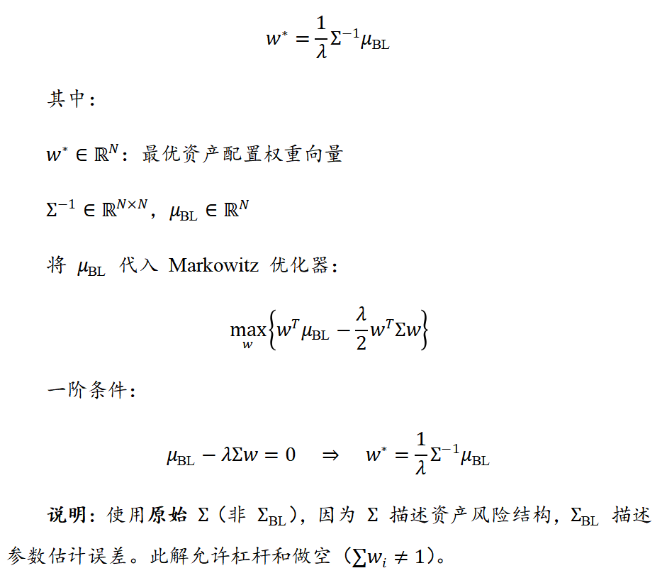 Black-Litterman(BL)模型是一种在资产配置中广泛应用的贝叶斯组合优化模型,由Fischer Black与Robert Litterman于1990年代初在高盛公司任职期间提出,其核心思想在于通过贝叶斯框架将市场均衡隐含收益(作为先验分布)与投资者主观观点(作为似然函数)进行系统性融合,从而生成稳健的后验预期收益估计,以克服传统均值-方差优化模型对输入收益高度敏感所导致的组合极端化与不稳定性问题;该模型不仅尊重市场整体结构所蕴含的信息,还允许投资者以结构化方式(如相对或绝对收益观点及其置信水平)注入主动判断,最终输出兼具市场中性与观点驱动特性的优化资产配置,在全球养老基金、主权财富基金及多资产量化策略中被广泛采用,成为现代投资组合理论从理论走向实践的重要桥梁。