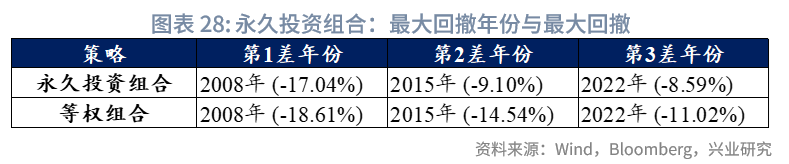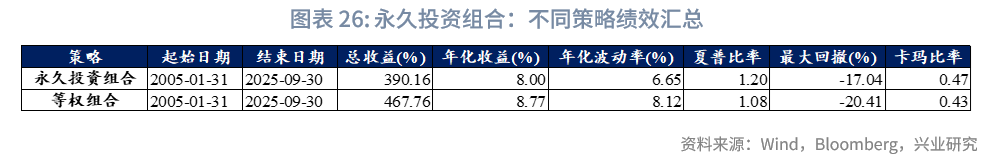 风险收益方面,样本期内,永久投资组合策略几乎严格优于等权策略。二者收益接近,永久投资组合年化收益8.00%,等权组合年化收益8.77%;但永久投资组合波动显著更小,年化波动率6.65%,等权组合为8.12%;回撤更低,最大回撤-17.04%,等权组合为-20.41%;且夏普比率更高,达1.20,等权组合为1.08。从最大回撤年份来看,得益于25%现金的配置缓冲,2008年永久投资组合回撤17.04%,低于等权组合的18.61%。总结来看,永久投资组合通过提高现金比重,有效减少了组合波动与回撤,且收益未出现明显下降。