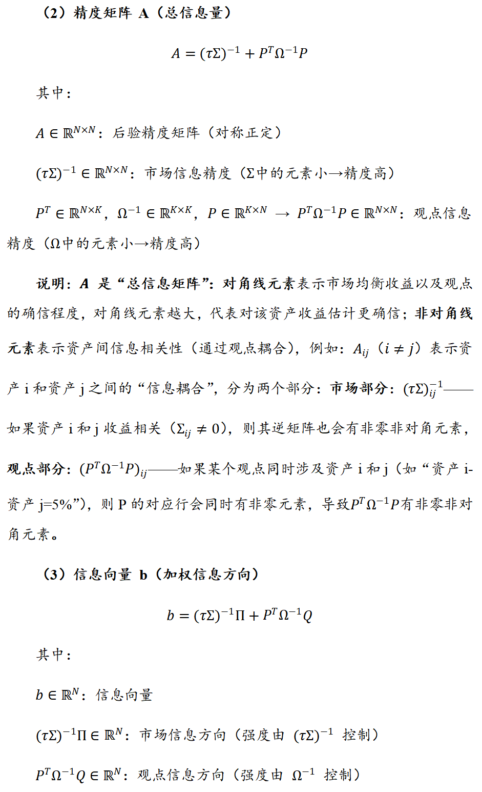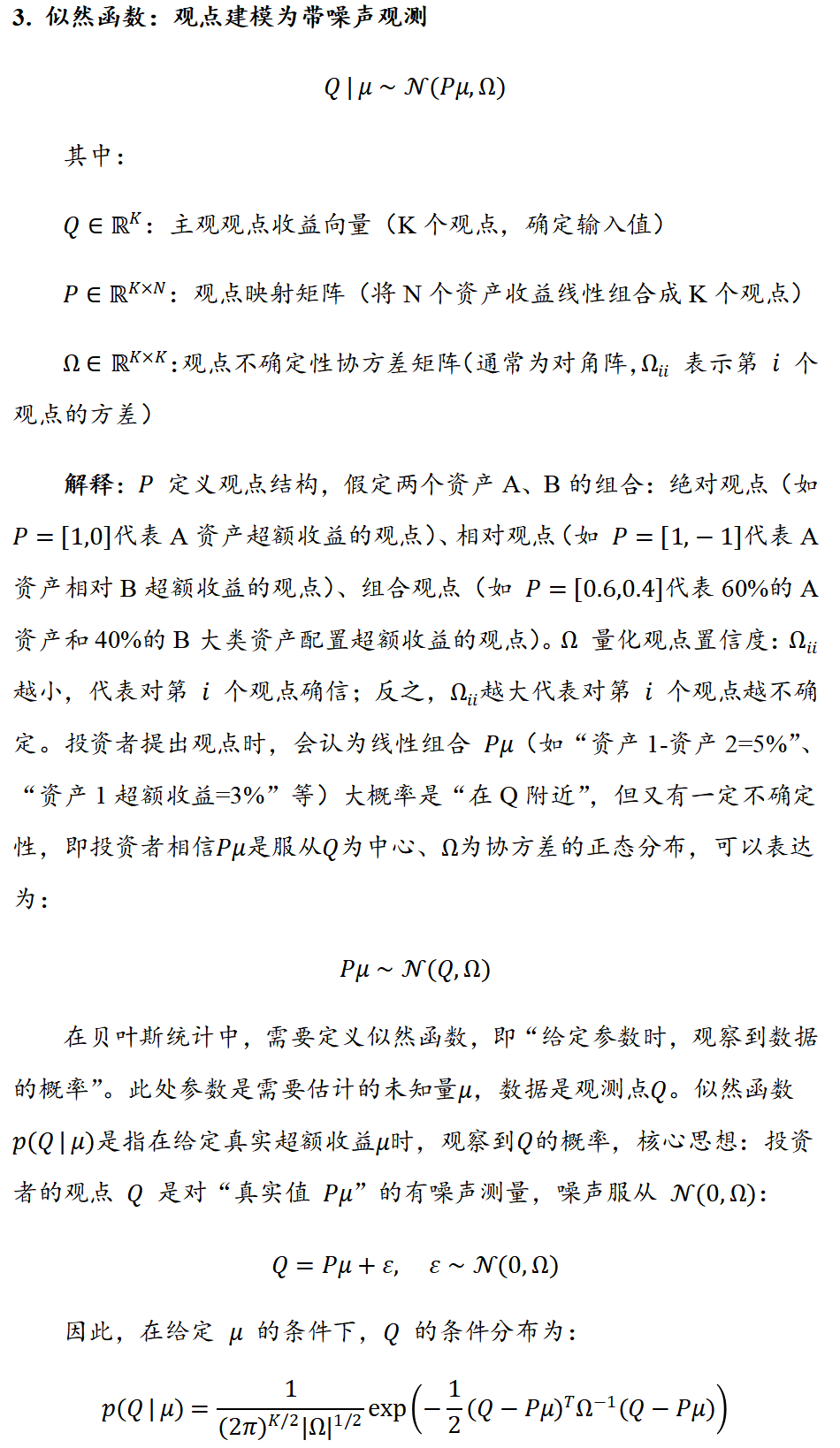BL模型基于贝叶斯方法,核心是整合两类关键信息以优化预期收益输入:一是市场均衡收益(先验信息),无需投资者直接预测资产绝对收益,而是通过全球市场组合权重反推隐含的市场均衡收益率,作为市场共识的中性基准;二是投资者主观观点(最大似然),提供结构化框架允许投资者以绝对或相对形式表达对资产未来表现的前瞻性判断,并明确观点的信心水平。两类信息经贝叶斯整合后生成综合预期收益向量(后验收益),作为MVO模型输入进行组合优化,最终输出的权重通常更稳定、分散且契合投资直觉。