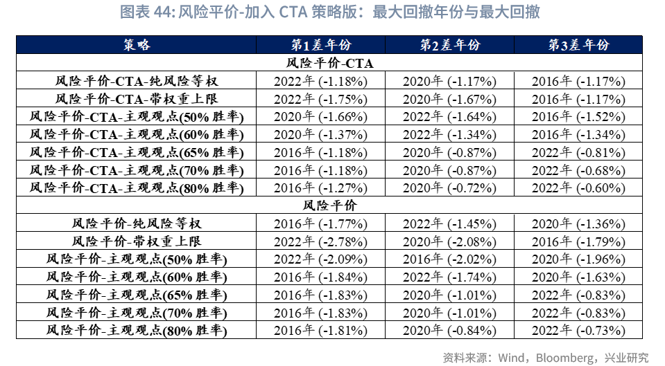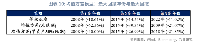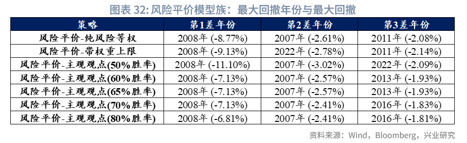 由于后文“Black-Litterman-风险平价模型”部分将以风险平价模型(无观点)版作为基准,此处暂不对模型权重调整展开过多描述(权重变动详情可见附录“风险平价模型结果”);而在最大回撤控制上,风险平价模型族表现更为突出。