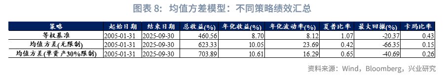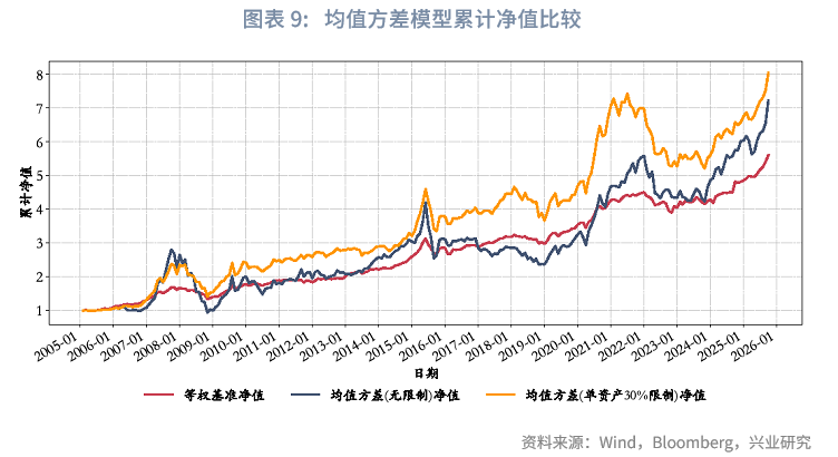 本文采用滚动4年的历史数据计算资产的预期收益率与协方差矩阵,而对大多数资产而言,4年时长已足以形成一个小周期。我们设计了两个版本的均值方差模型:(1)均值方差-无仓位限制版本(作为基准版本):不设置单个资产的仓位上限;(2)均值方差-单资产30%限制版本:在无仓位限制版本的基础上,增设单个资产30%的权重上限。同时,将等权配置模型作为参照模型,用于与上述两个均值方差模型版本进行对比分析。