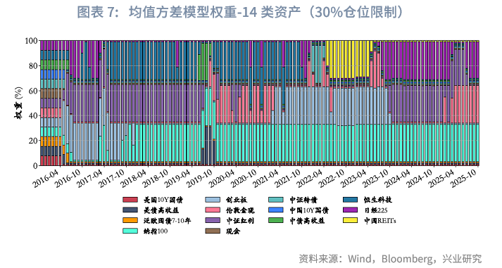 组合权重方面,均值方差模型往往倾向于将权重集中投向组合内的少数几类资产,导致其余资产权重极低,同时其仓位呈现出较强的动量属性。从样本期内各资产的平均仓位来看,纳指100以18.6%的占比位列第一,其后依次为中证红利、伦敦金、中债高收益及创业板;上述六类资产的平均仓位总和约为76.9%。