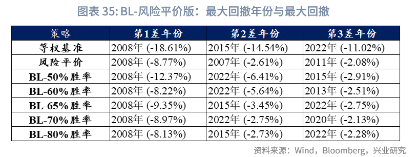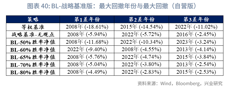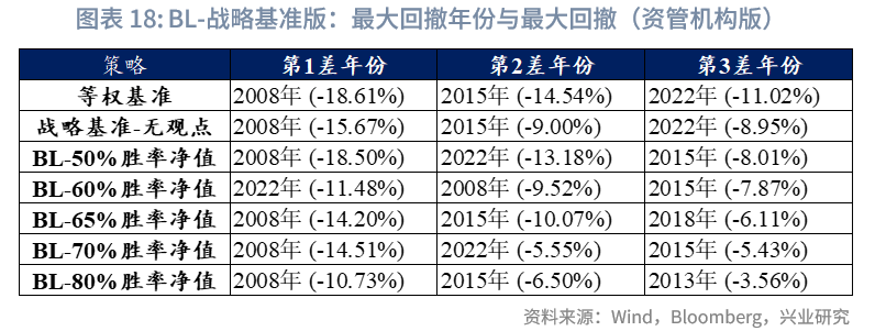 最大回撤年份分析:以65%胜率为例,与“BL-战略基准版”相比,“BL-风险平价版”的初始权重由风险平价机制计算得出,2008年日经225、纳指100、中证红利的权重基本在年底降至0,而2008年1月时,上述资产的权重总和为16.8%。相较于“BL-战略基准版”事先设定基准权重的模式,风险平价模型对资产波动的敏感性更高,因此在极端回撤场景下,其回撤控制能力也更为出色,尤其适合对风险与回撤要求极高的机构。此外,“BL-风险平价版”在其余年份的最大回撤,基本都控制在3%以内。