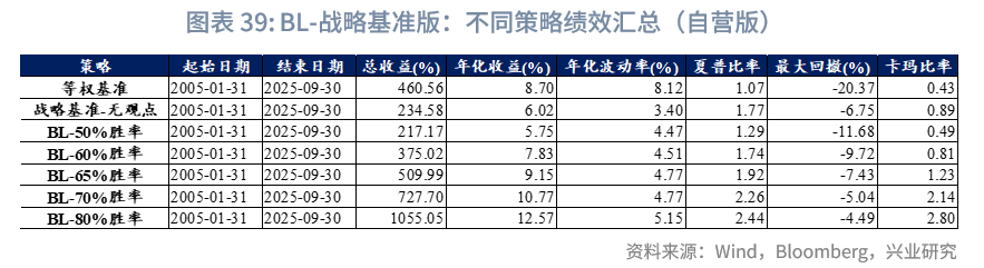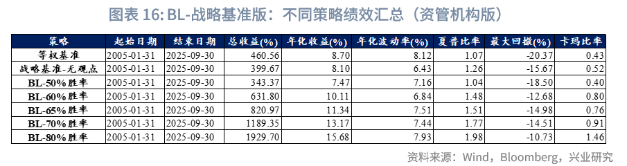 以资管机构的战略基准权重版本为例(自营版本可见附录,相关结果差异较小),根据2005年1月至2025年9月的回测结果,不同策略的表现对观点准确性存在显著依赖。数据显示,当BL模型中嵌入观点的胜率为50%时,其策略的总收益与年化收益均低于无任何主观观点的战略基准策略。值得注意的是,回测早期(如2005-2010年)核心资产数量较少(仅3个或5个),此时50%的胜率在实际计算中因四舍五入略高于50%(例如3类核心资产中选择2类准确,实际胜率为66.7%);而后期扩展至10类关键资产时,50%胜率则恰好对应5类资产判断准确。尽管这类结果受随机因素影响,但仍可表明:在此胜率水平下,引入主观观点并未产生增量价值。