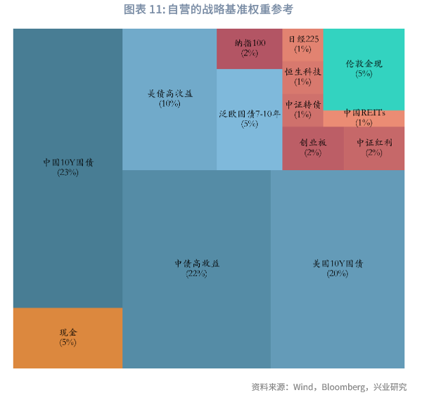 需注意的是,两类主体均以固收类资产作为配置底仓,具体结构与权重存在以下特征:对于资管机构,截至2025年9月底,股票型、混合型、债券型、货币市场基金占比分别为14.90%、9.22%、32.02%、40.28%,剩余为QDII、FOF基金等;若剔除货币基金,债券型基金在股票型、混合型、债券型基金中的占比达57%。而银行理财的固收资产比重更高。对于自营业务,固收类资产占比通常更大:上市券商自营的权益类资产占比平均约8%-15%,固收类占比则超过80%。商业银行自营中直接债券投资占比超80%,其余为基金、非标等;保险自营的债券投资占比约50%,股票、长期股权投资及基金占比约20%,剩余为银行存款等。上述背景下,本文设定两类主体的具体资产权重如下:自营的现金、固收、权益及类权益、商品权重占比分别为5%、80%、10%、5%;资管机构的对应权重则为8%、50%、32%、10%,各资产子类的具体权重可参见下图。