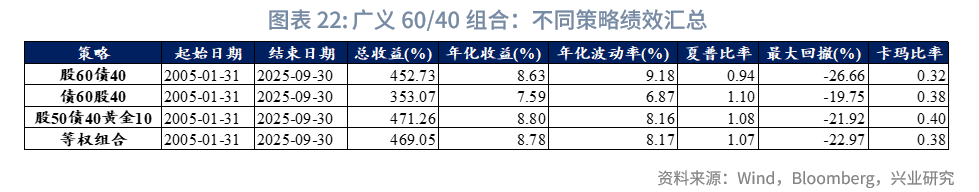 组合权重方面,广义60/40组合均采用固定权重配置方案,每月仅需先明确可配置资产池(例如判断部分指数当月是否有可用数据),具体细节此处不再赘述。