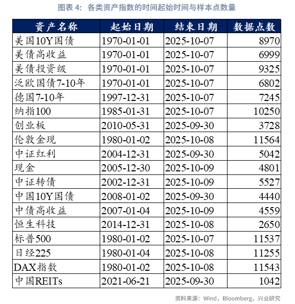 各类资产指数的起始时间与样本点数量如下表所示。考虑到多数指数的起始时间特征,若未特别说明,本文研究样本期统一设定为2005年1月1日至2025年9月30日。所有资产权重调整以当月月末为时间节点,即于当月月末确定下一个月的资产配置权重;同时,鉴于各指数起始时间存在差异,每月将先筛选确定有效资产池(仅纳入当期已有完整数据的资产),再开展后续配置操作。