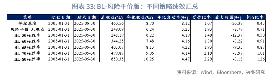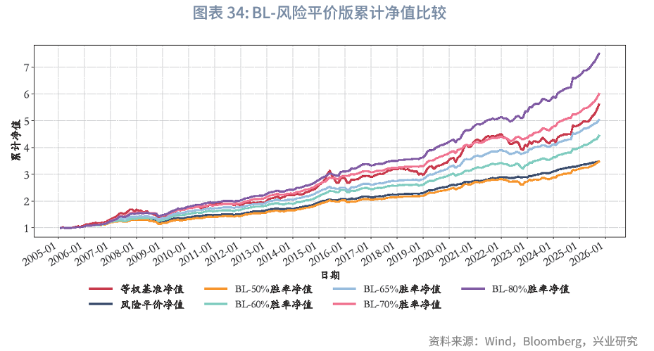 我们对“BL-风险平价”的多个版本展开对比,具体包括基准(各类资产等权重)、无观点版(风险平价权重)与生成主观观点版;其中主观观点的胜率水平仍设置为50%、60%、65%、70%,且观点生成方法与“BL-战略基准”完全一致,此处不再赘述。