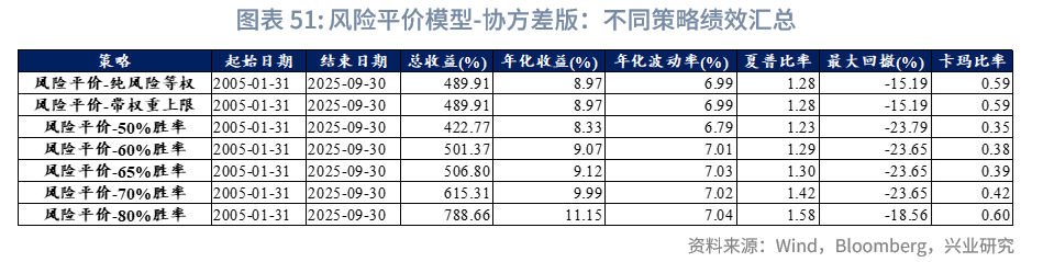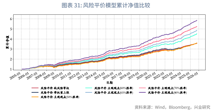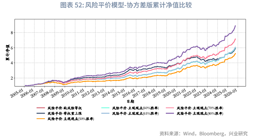 我们设计的风险平价策略分为三个版本:(1)纯粹风险等权(基准版本),95%权重按非现金资产历史波动率倒数分配(确保各资产风险贡献相等),剩余5%固定为现金权重;(2)“风险平价-带权重限制”,在纯粹风险等权版本基础上增设单资产30%权重上限:若资产权重超出上限则固定为30%,剩余权重重新分配以维持风险平价;(3)“风险平价-结合主观观点”,以纯粹风险等权版本为基础,对核心资产按不同胜率施加主观观点调整,并通过相对超额幅度差异化处理波动率(进而影响权重):先通过“资产未来实际收益/历史最大绝对收益”计算相对超额幅度,量化资产收益偏离自身历史水平的程度;再根据主观观点判断准确性(正确/错误)与资产未来收益方向(正/负),差异化生成基础调整因子,若观点正确且资产未来上涨,基础因子按“0.7-相对超额幅度×0.2”计算(相对超额幅度越高,因子越低,波动率降幅越大),若观点正确且资产未来下跌,基础因子则按“1.5+相对超额幅度×0.5”计算(亏损幅度越大,因子越高,波动率增幅越大);同时叠加±0.05或±0.1的随机扰动,避免单一观点的极端影响。最终,通过调整后的波动率间接优化风险平价权重,让“高超额收益且判断正确”的资产获得更高配置,“亏损且判断正确”的资产降低权重。此外,我们设置了50%、60%、65%、70%、80%多个胜率水平。