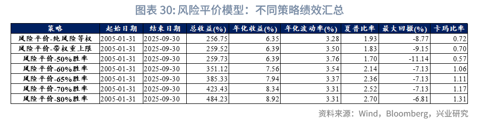 风险平价模型优点在于能够显著降低单一资产对组合的冲击,提高夏普比率,并在历史上展现出稳健的回撤控制能力。然而,该方法未显式纳入收益率预期,如果某一时期某类资产的预期收益偏低,风险平价仍可能给予其较高权重,从而导致潜在的机会成本。基于这些特点,风险平价更适合:1)追求稳健的养老金、银行理财子公司;2)具备较强单一资产超额获取能力的量化私募;3)缺乏预测能力的个人投资者;4)资金体量庞大、不支持高频择时的机构(如社保基金、养老金)。